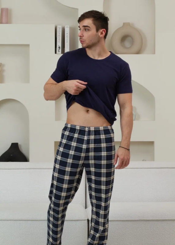 UPM-111 Пижама мужская с брюками (M, Темно синий-бежевый)
